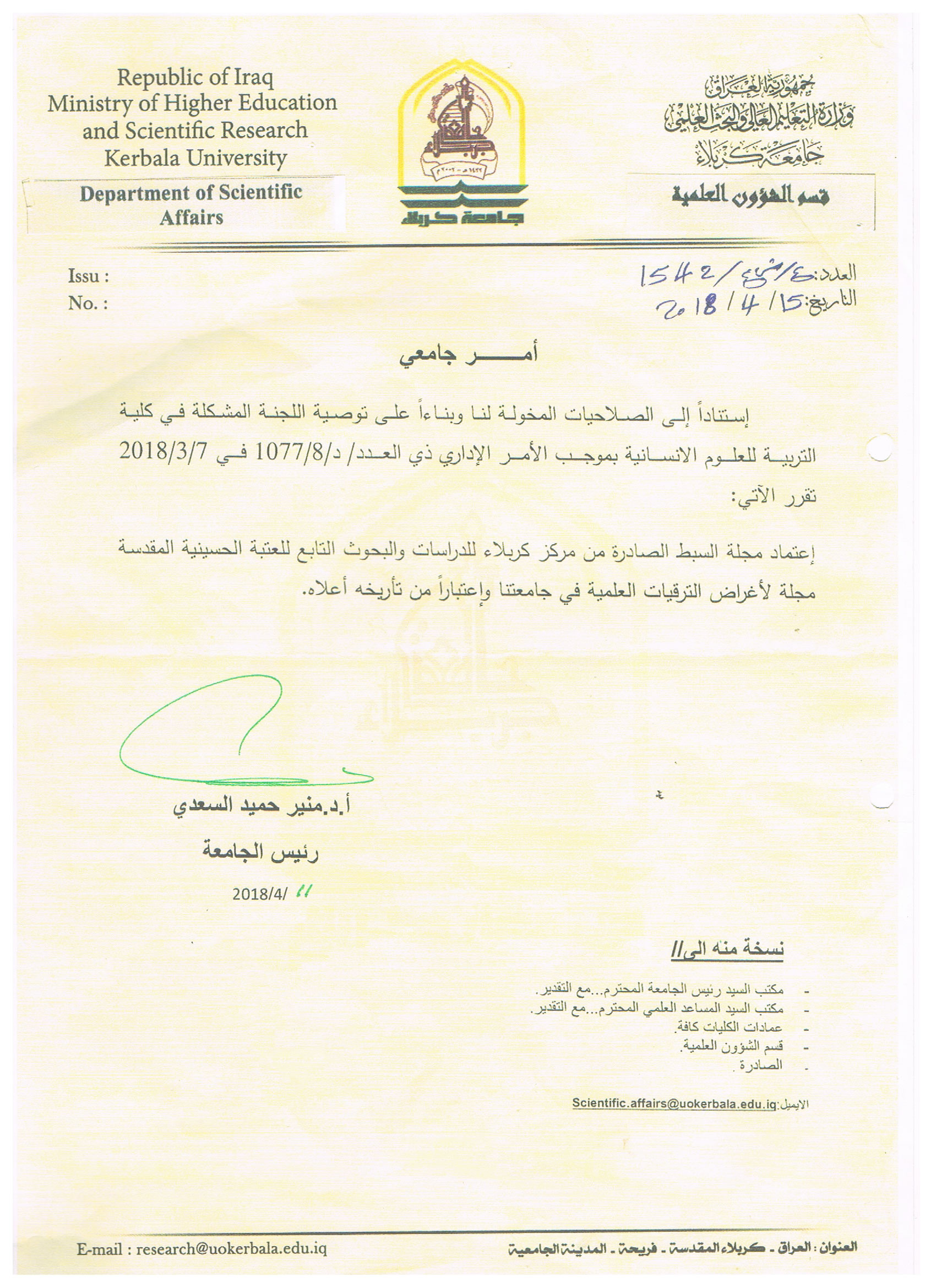 جامعة كربلاء قسم الشؤون العلمية ذي العدد :ع / ش ع / 1542 بتاريخ 15 / 4 / 2018