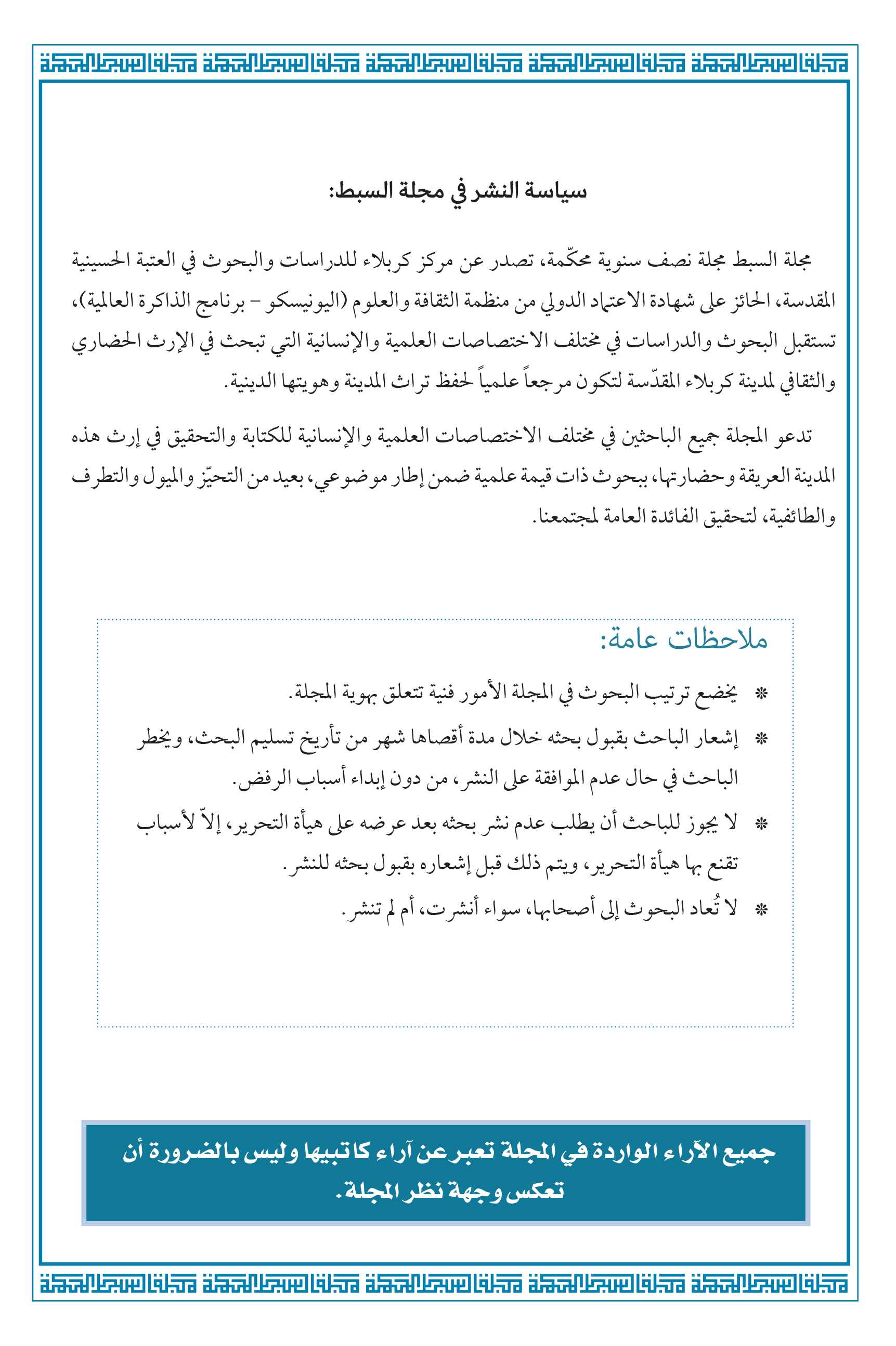 مجلة السبط العلمية المحكمة التي تصدر عن مركز كربلاء للدراسات والبحوث التابع الى العتبة الحسينية المقدسة والمعتمدة من قبل وزارة التعليم العالي والبحث العلمي